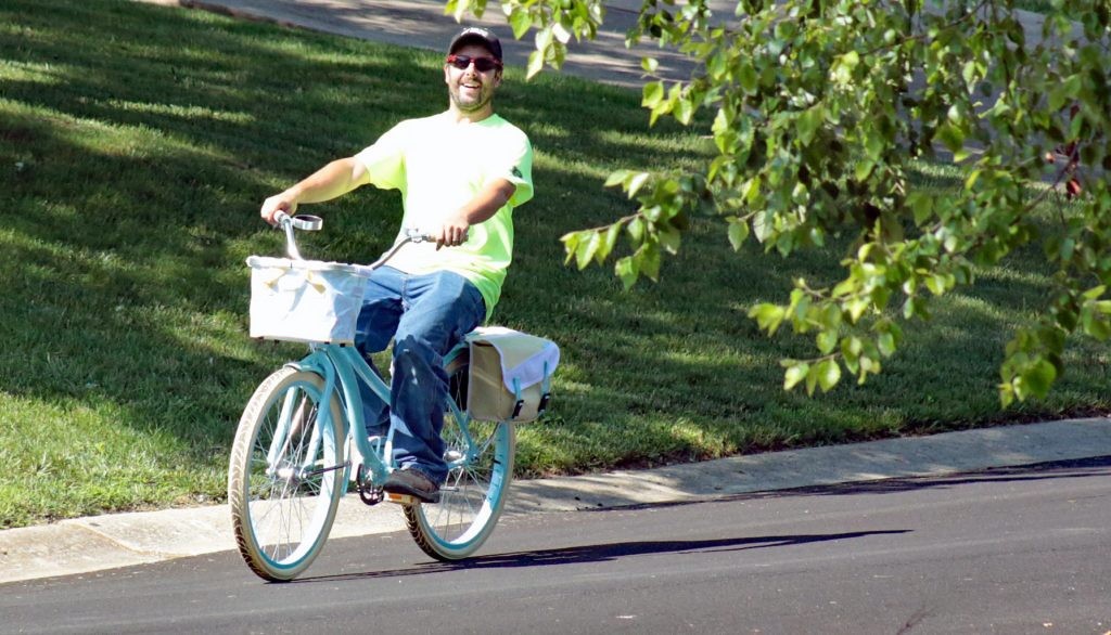 (When Aaron aired up the tires, he rode my bike to test it out. He didn’t know I had the camera. He’s such a dork.