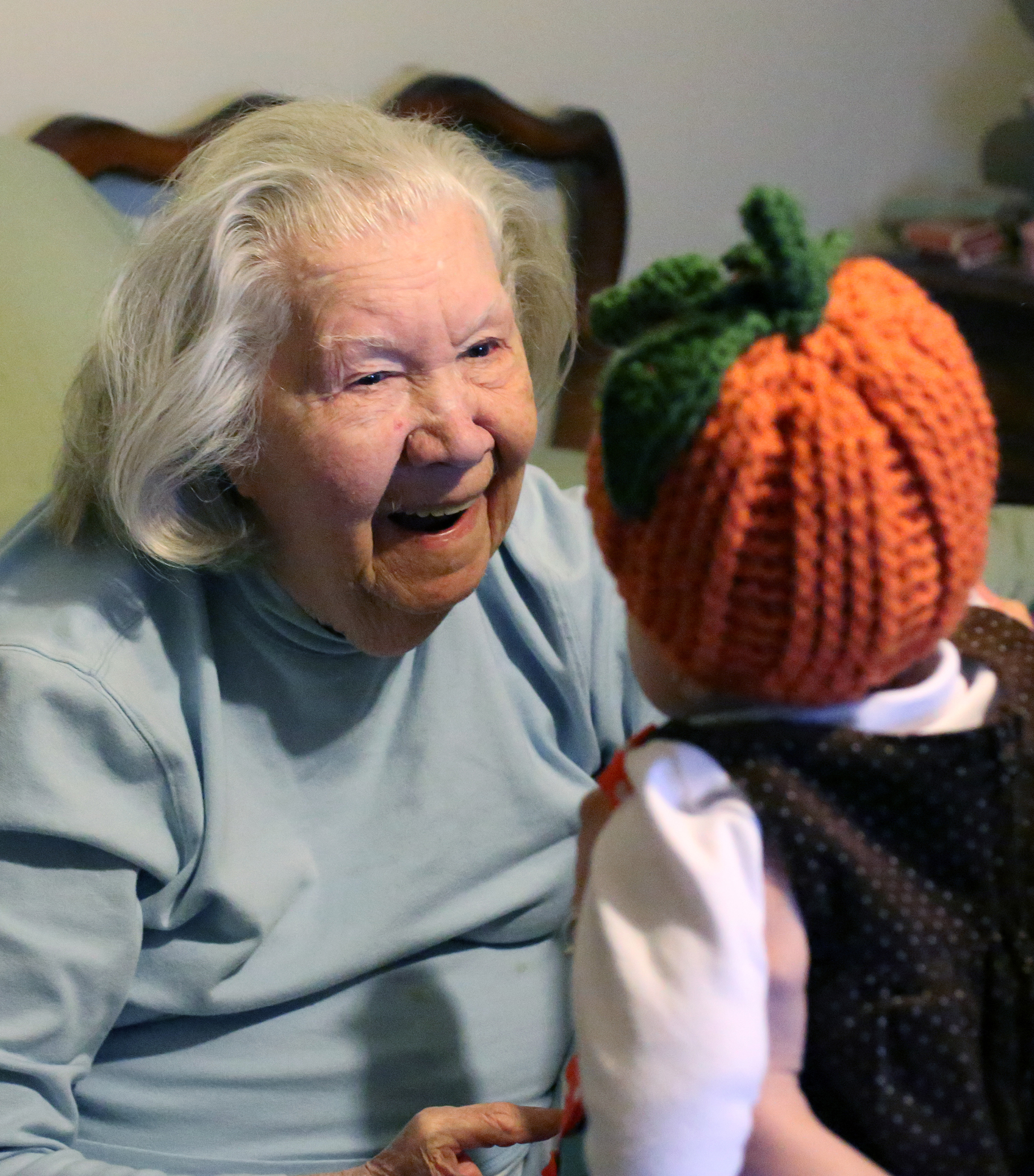Once we got there, I took Faith into Grandma’s bedroom to see her.  Grandma was awake, and sitting up in bed.  It took her a minute to recognize us, and once she did… her face lit up!  She has been wanting to see Faith ever since she was born!
